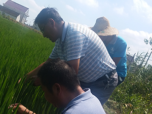 | 通聯(lián)技術人員在田間對作物病蟲草害發(fā)生情況進行實地調(diào)查 | |